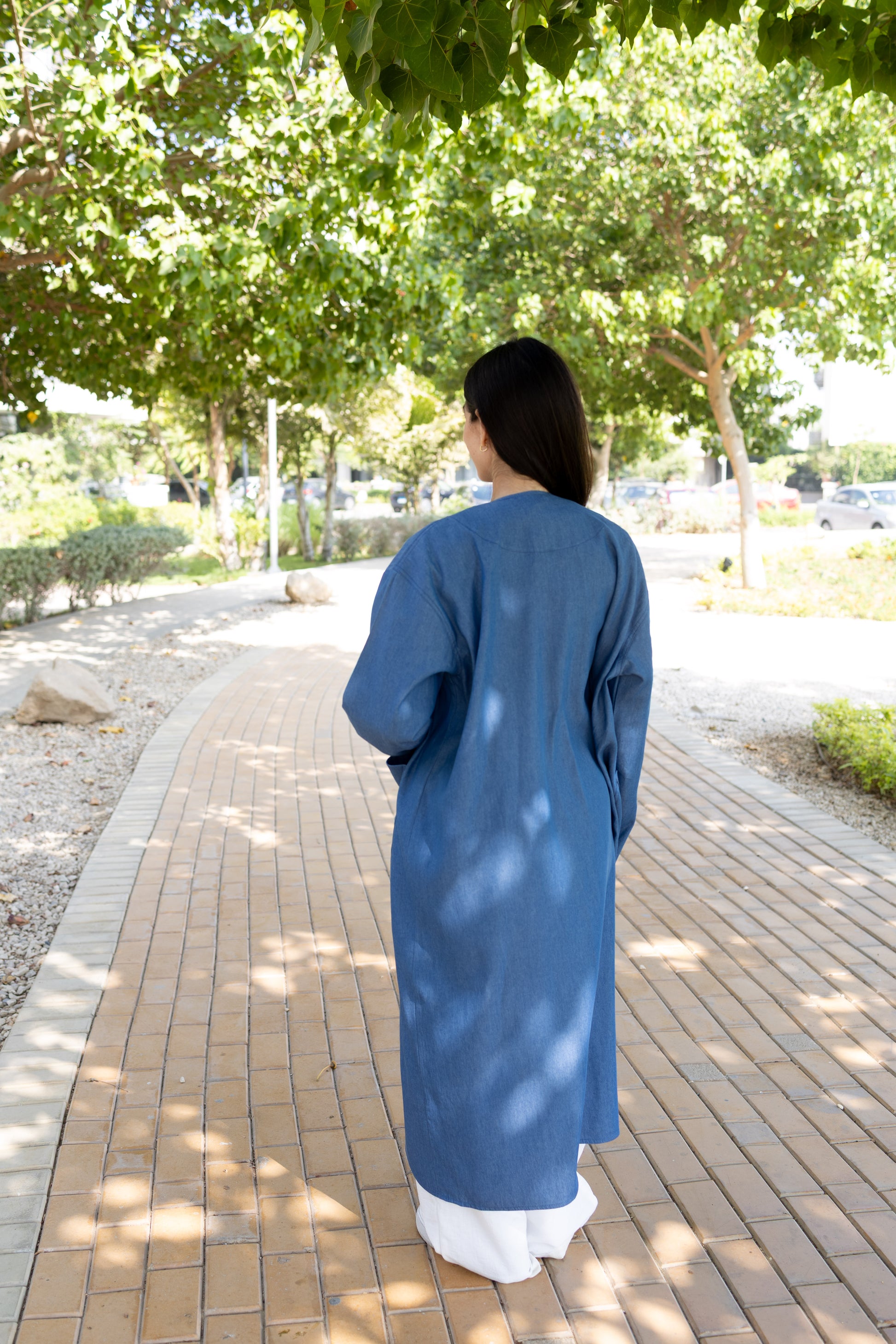 The Azalea Cardigan brings effortless sophistication to your wardrobe. Designed in a deep blue tone with delicate printed inner detailing, this longline cardigan combines structure and flow for the perfect modest silhouette.