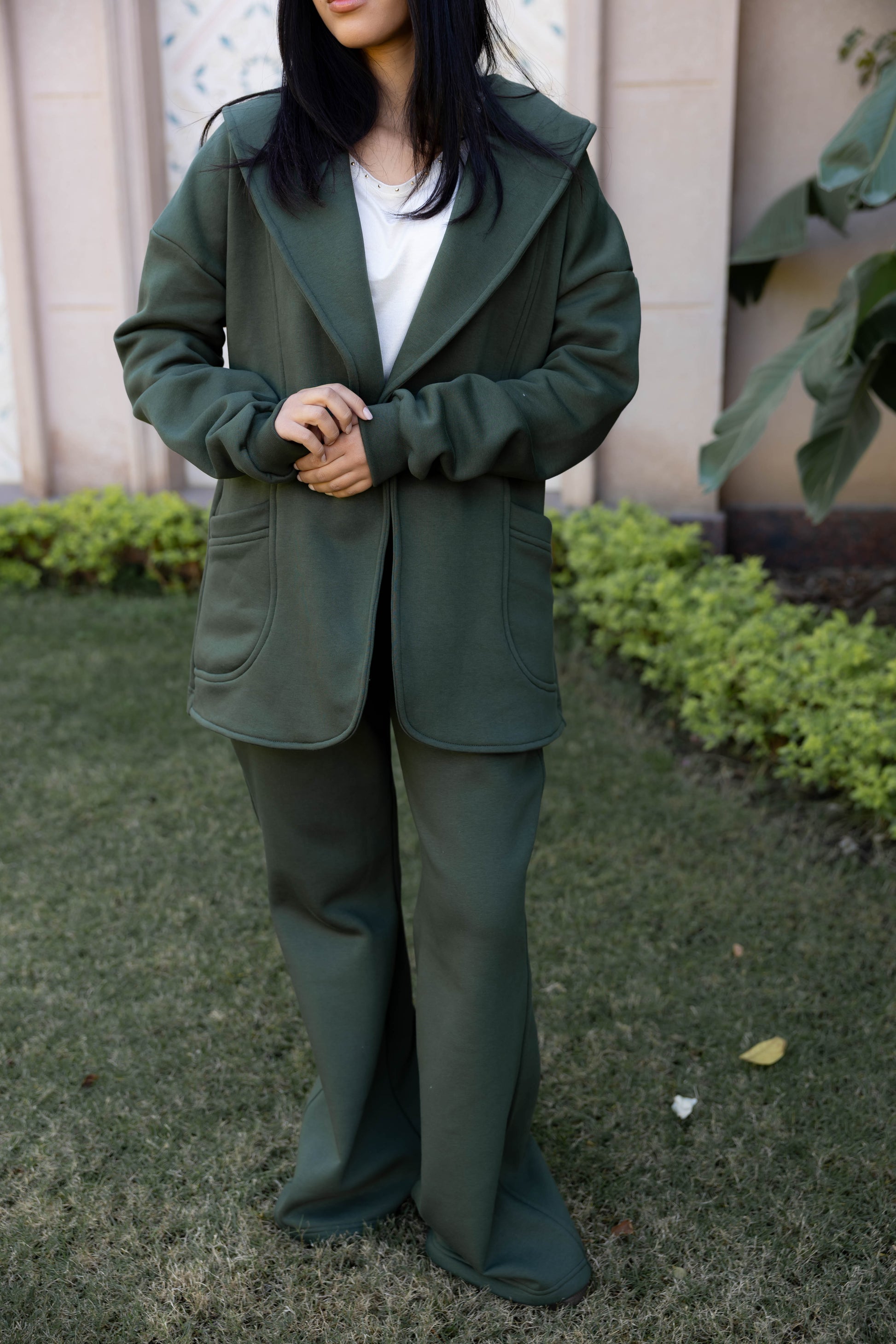 Redefine your winter stride with The Motion Blazer Shawl Collar Set in Deep Olive. A key piece in The Momentum Edit, this co-ord balances relaxed comfort with a structured, active silhouette.