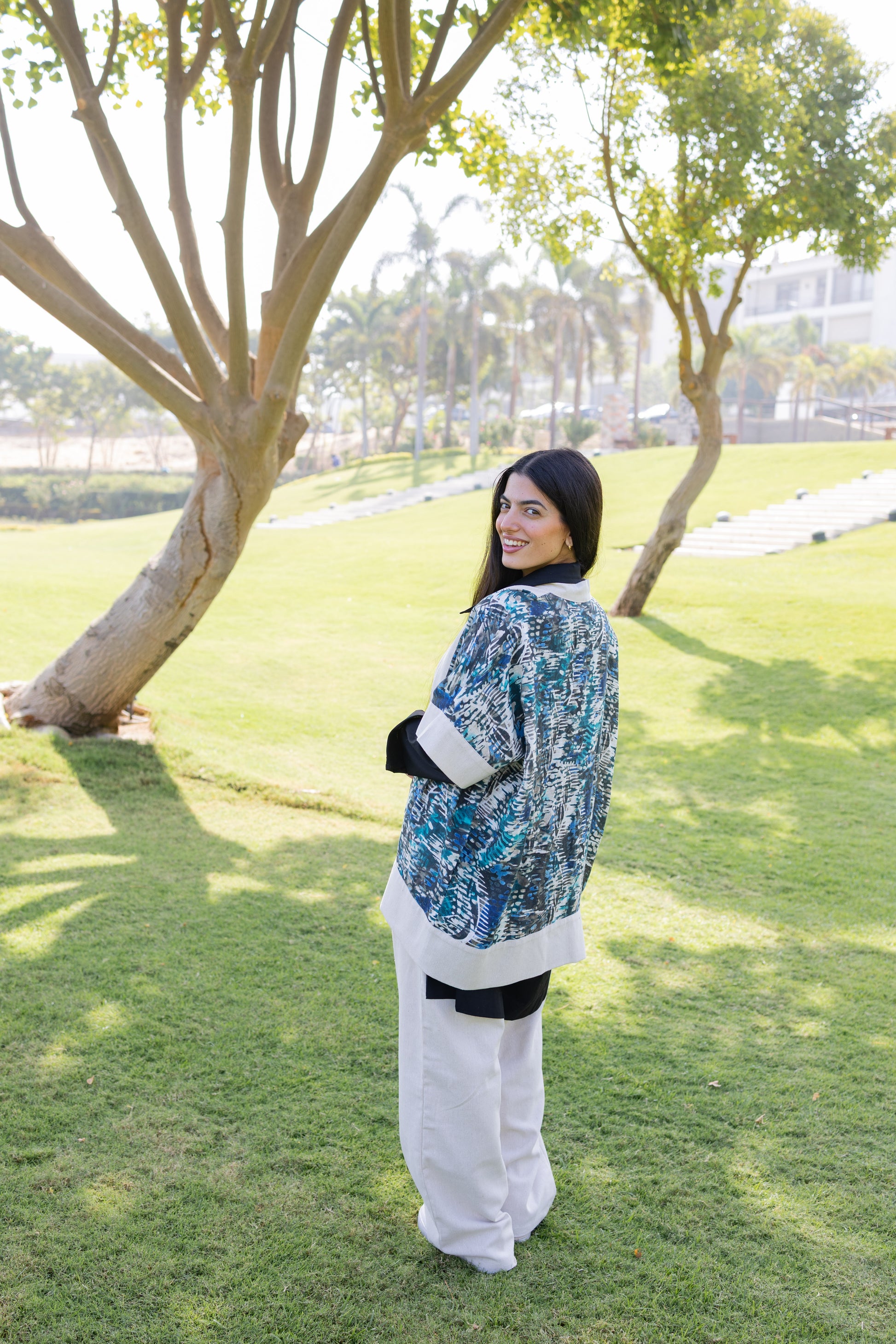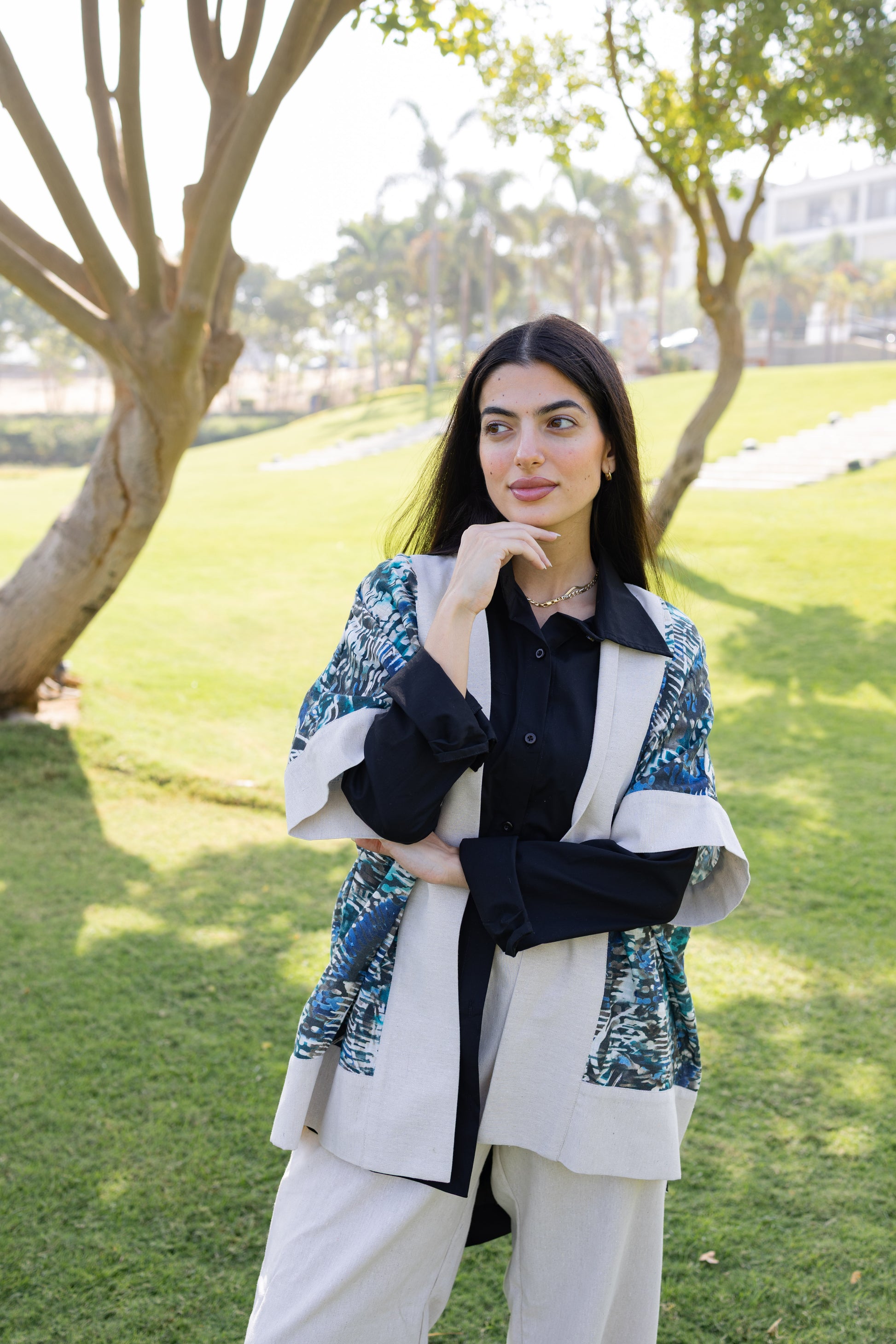 - A lightweight open jacket with soft cream panels and printed detailing for a pop of texture.